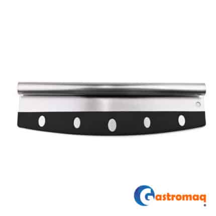- Cortador de pizza profesional tipo "Media Luna" o "Mecedora" fabricado íntegramente en acero inoxidable de alta calidad. A diferencia de los cortadores de rueda, este modelo consiste en una hoja única de gran tamaño con un filo rectificado. Posee un mango superior integrado (o doble empuñadura) que permite aplicar presión uniforme con ambas manos, asegurando cortes rectos y limpios.