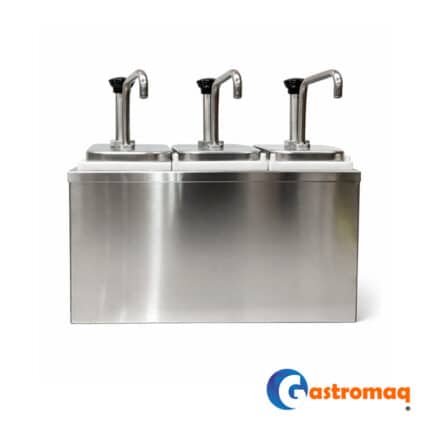 - Dispensador Salsa Acero 3 Depósitos 6 lts. Toppo Gastromaq, ideal para puntos de venta con alto flujo de clientes. Permite centralizar los tres aderezos principales en una sola unidad compacta y robusta. Su sistema de triple bombeo manual garantiza una higiene superior al evitar el contacto directo del usuario con el producto o el recipiente original.
