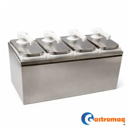 - Dispensador Salsa Acero 4 Depósitos 8 lts. Toppo Gastromaq, diseñada para ofrecer la máxima versatilidad en el servicio de salsas. Este equipo permite organizar cuatro tipos de aderezos diferentes de forma higiénica y eficiente. Su estructura de acero inoxidable de gran formato está pensada para resistir el uso constante en entornos de alta rotación, manteniendo la estética y la limpieza del establecimiento.
