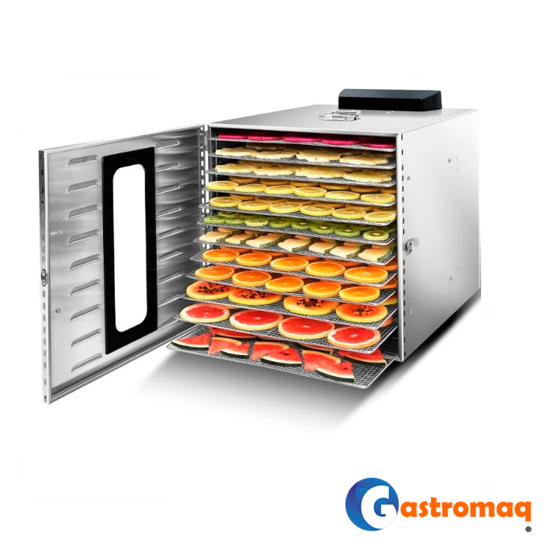 - El deshidratador sobremesa Gastromaq de 12 bandejas está diseñado para la deshidratación eficiente de alimentos en cocinas profesionales y emprendimientos gastronómicos con mayor volumen de producción. Permite trabajar frutas, verduras, hierbas, carnes, hongos y otros productos, logrando un secado uniforme y controlado.