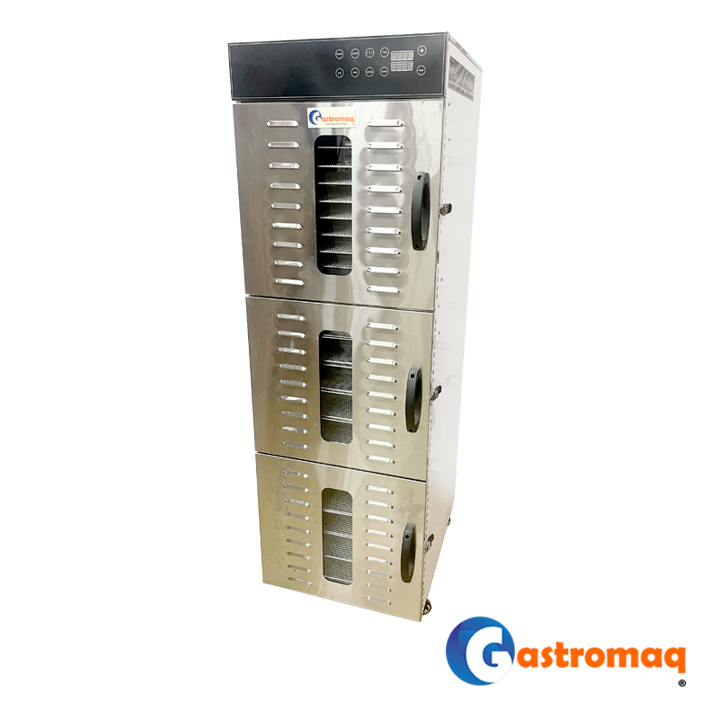 - El deshidratador sobremesa Gastromaq de 30 bandejas está diseñado para procesos de deshidratación de alto volumen en cocinas profesionales y plantas de producción gastronómica. Es ideal para frutas, verduras, hierbas, carnes, hongos y otros alimentos que requieren un secado uniforme y controlado a gran escala.