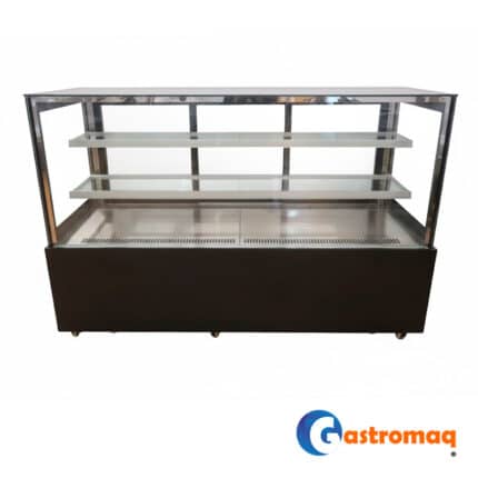 - La Vitrina Pastelera Cuadrada Gastromaq de 3 niveles, color negro y 1,5 metros es ideal para exhibir y conservar pasteles, tortas y postres con una presentación moderna y profesional.
