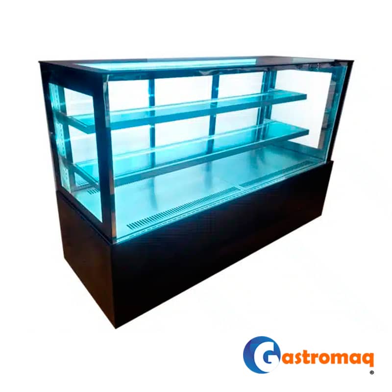 - La Vitrina Pastelera Cuadrada Gastromaq de 3 niveles, color negro y 1,5 metros es ideal para exhibir y conservar pasteles, tortas y postres con una presentación moderna y profesional.